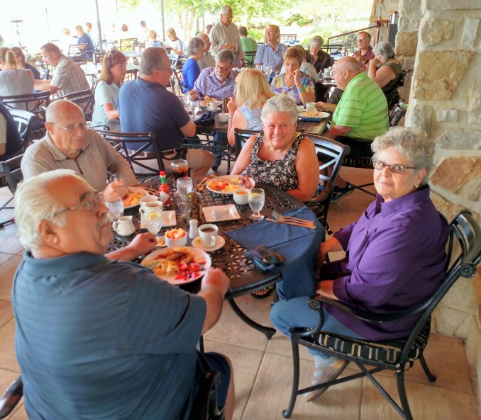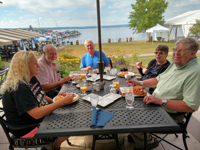 Breakfast Sunday morning at The Inn on the Lake. Sandy Kost and Dale Pike, Bill Reeser, Barb Grevell Herman, John North